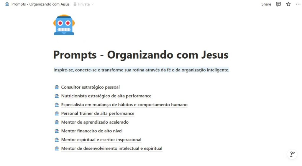 Com prompts estratégicos para planejamento, produtividade, saúde, espiritualidade e mais, você recebe direcionamento inteligente para organizar sua rotina, tomar decisões mais assertivas e estruturar hábitos de forma prática e eficaz!